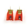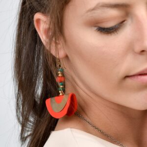 עגיל המשלב תליון פליז ועור בצורת חצי עיגול, חרוזי טורקיז ורובי , מיוצר בעבודת יד, מתלה העגיל עשוי מגולדפילד.