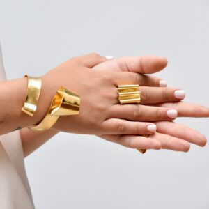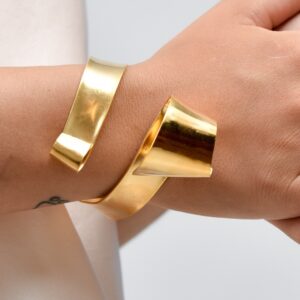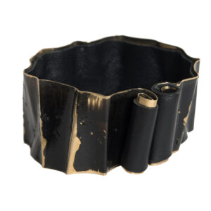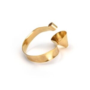 צמיד פליז בציפוי זהב או כסף לפי בחירה, עשוי בעבודה ידנית שהמעצבת פיתחה .