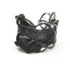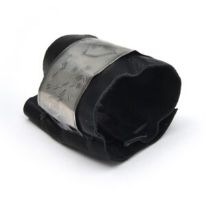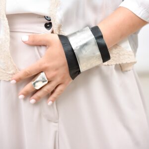צמיד דו שכבתי מעור שחור ופס אלומיניום בריקוע ייחודי, תוספת של תיפור ידני וסגירה עם מגנטים. מפוסלים ביחד בעבודת יד ייחודית.